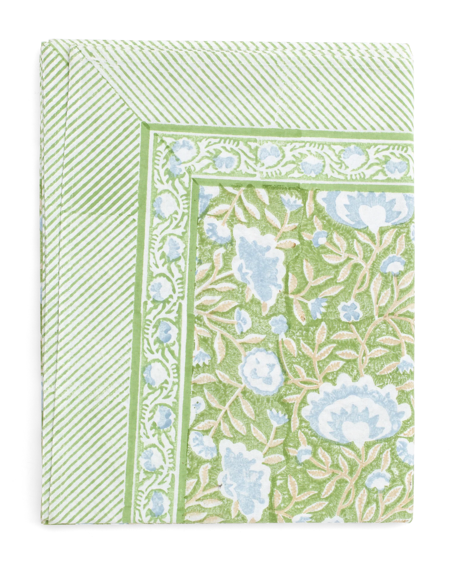 Det dekorativa mönstret är handtryckt med traditionell indisk blockprint, vilket innebär att varje duk har små unika variationer som förstärker dess genuina hantverkskaraktär. Tillverkad i bomull har den en behaglig struktur och ett vackert fall som gör den både praktisk och elegant.