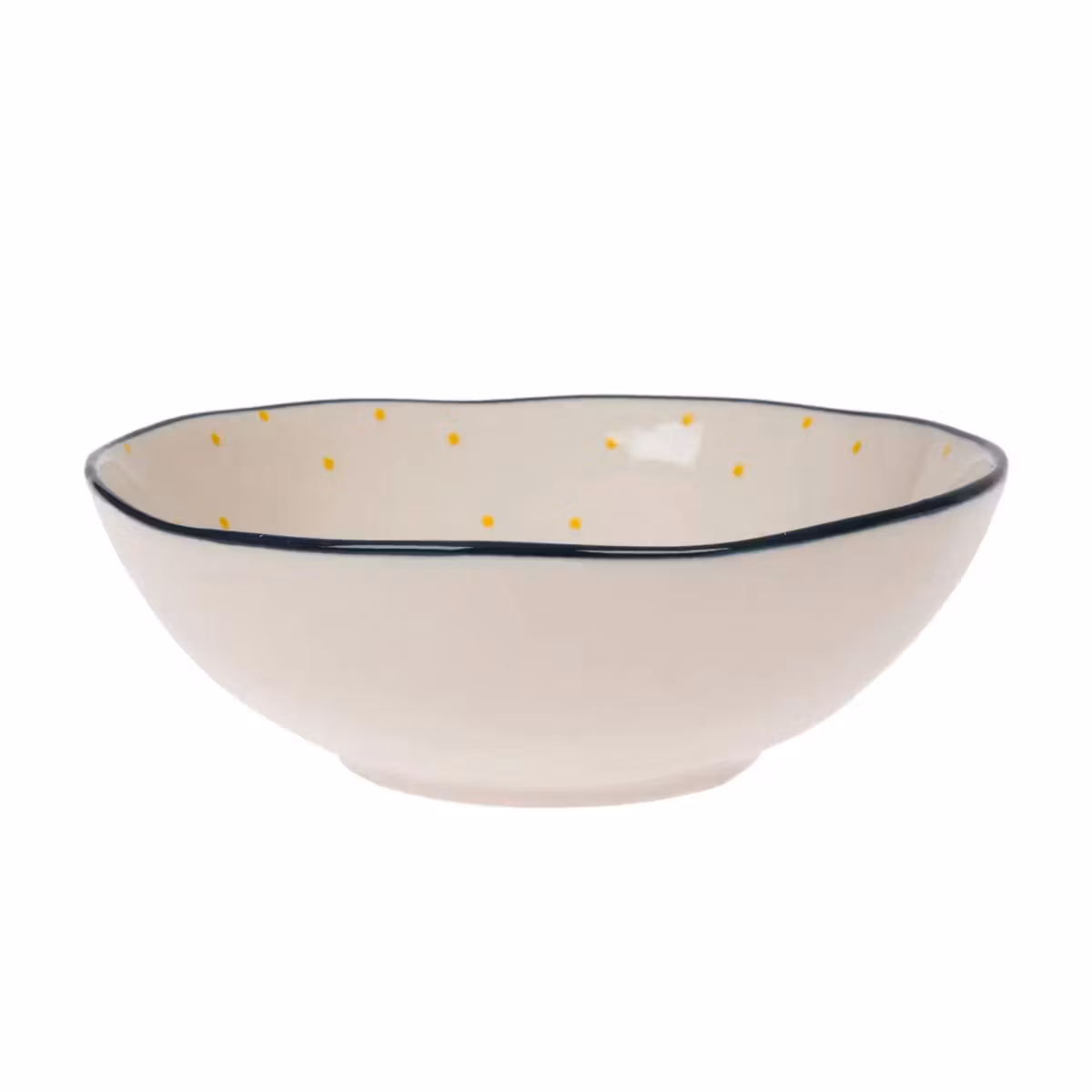 Denna rustika snacks-skål har Sophies bi-illustration i mitten omgiven av senapsgula prickar. Utmärkt för att visa upp goda snacks eller perfekt för filmkvällens tilltugg. Skålen har en organisk, kontrasterande blå kant, mönstret kan variera något.