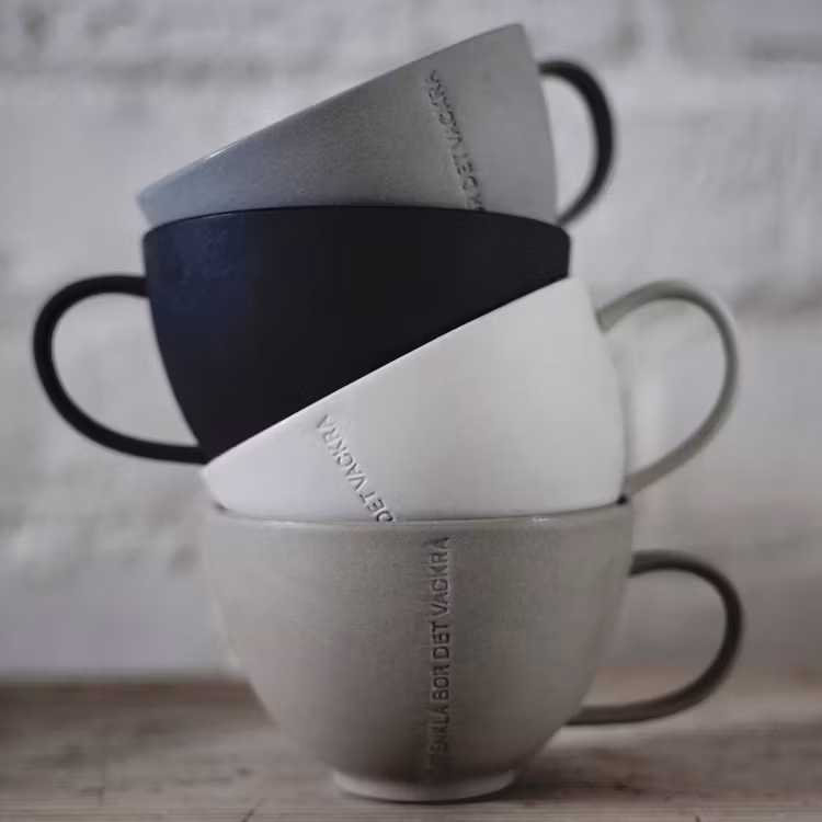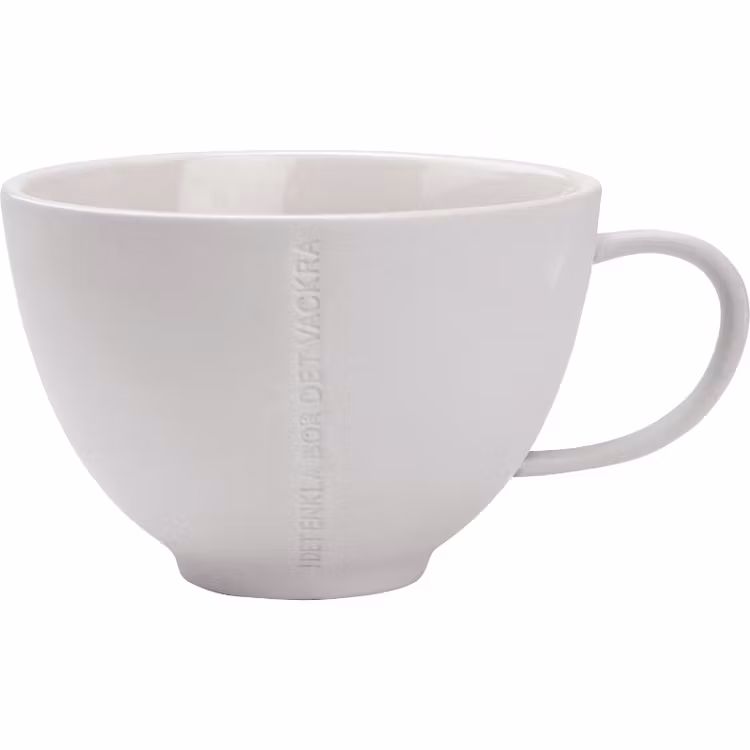 Ernst vackra, enkla och stilrena temugg i stengods med texten "I det enkla bor det vackra". Muggen är blank glaserad på insidan och oglaserad på utsidan. Design av Ernst Kirchsteiger.
