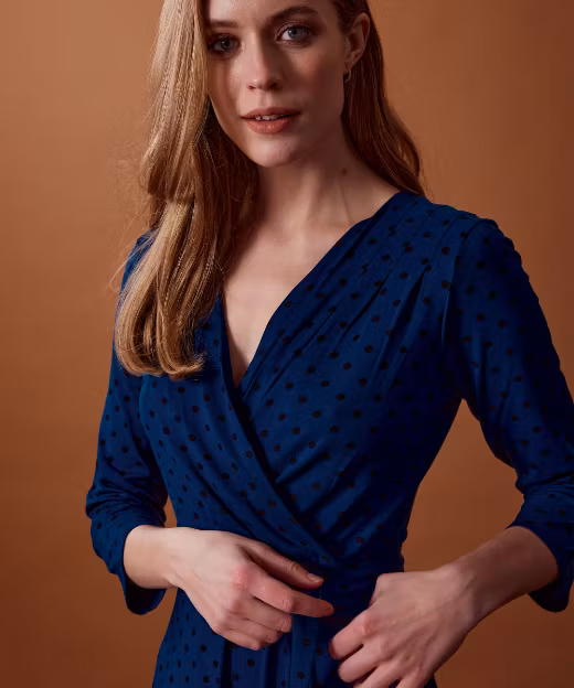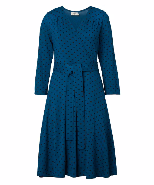 Stilfull omlottklänning från Jumperfabriken i blått med svarta prickar. Klänningen i ljuvligt skön viskos har kvinnlig passform med vackert omlottliv och V-ringning. Något avsmalnande trekvartsärm. Små lagda veck vid axelsömmarna ger ett fint passform över bysten. Kjol med vidd och fint fall. Avtagbart tygskärp i midjan. Klänningen slutar strax nedanför knät.