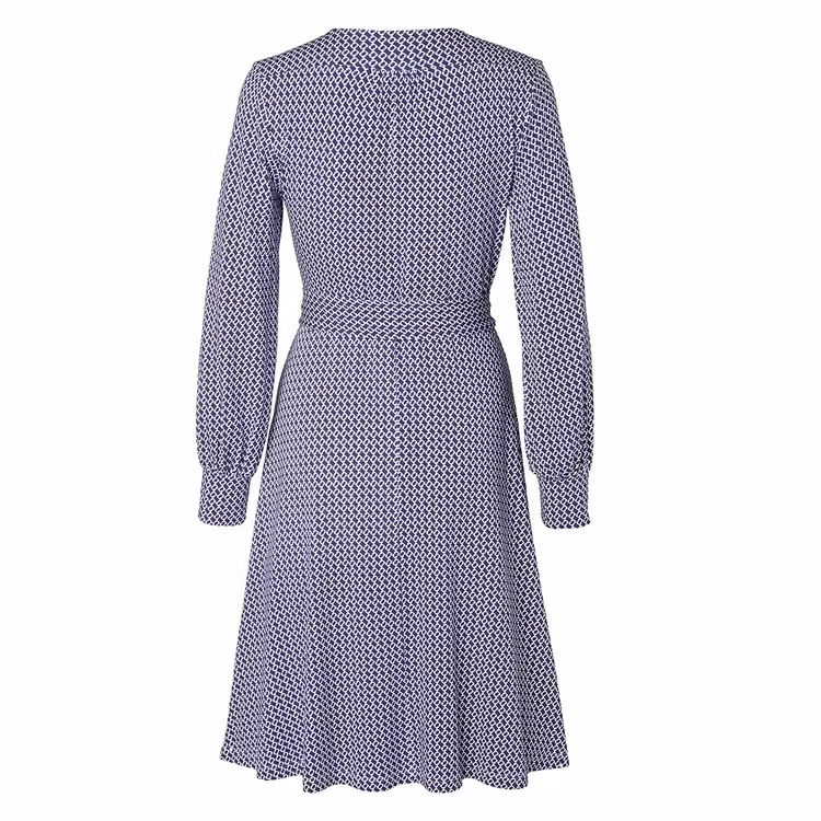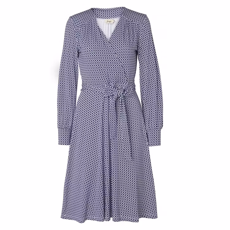 Klassisk klänning från Jumperfabriken i trendig omlottmodell. Klänningen i ljuvligt skön viskos har kvinnlig passform med vackert omlottliv och V-ringning. Kjol med vidd och fint fall. Avtagbart tygskärp i midjan. Lång, lite lagom lätt puffärm. Små lagda veck vid axelsömmarna ger ett fint fall över bysten och smickrande passform. Klänningen slutar vid knät. Tyget har vitt grafiskt mönster på marinblå botten.