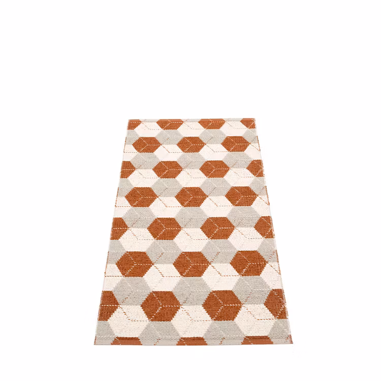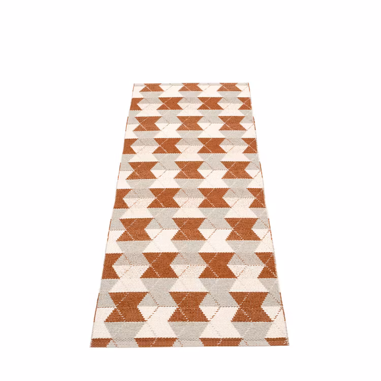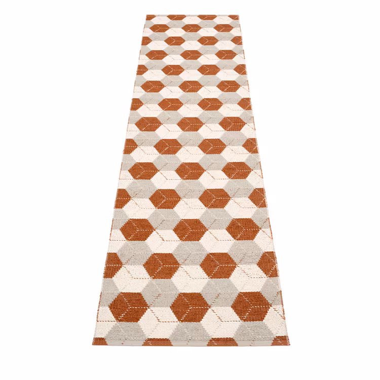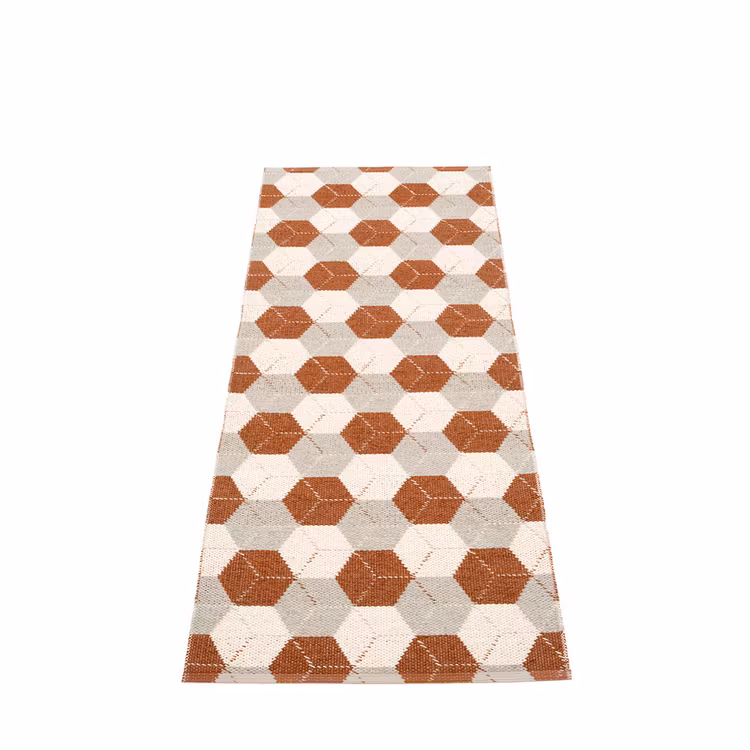 Trip är en matta från Pappelina med hexagonalt mönster i färgerna rostbrun, linnebeige och vaniljvit. Denna Pappelinamatta är vändbar med ett timglasinspirerat mönster på andra sidan i samma färger. Det blir som två mattor i en!