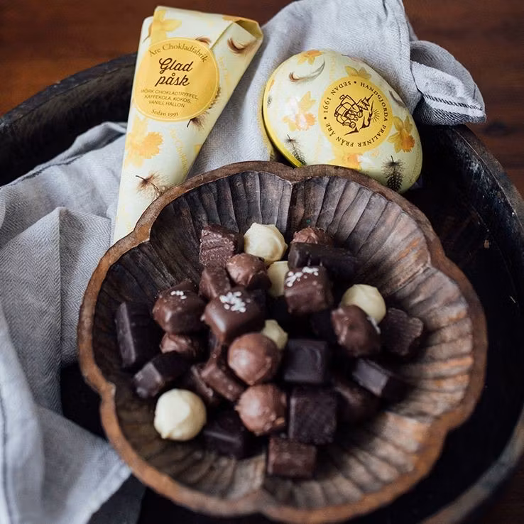 Påskägg från Åre Chokladfabrik fylld med en välkomponerad blandning av olika chokladpraliner. Ett lyxigt påskägg med handgjorda praliner som andas svenskt hantverk och tradition. Påskägget innehåller följande fina praliner: