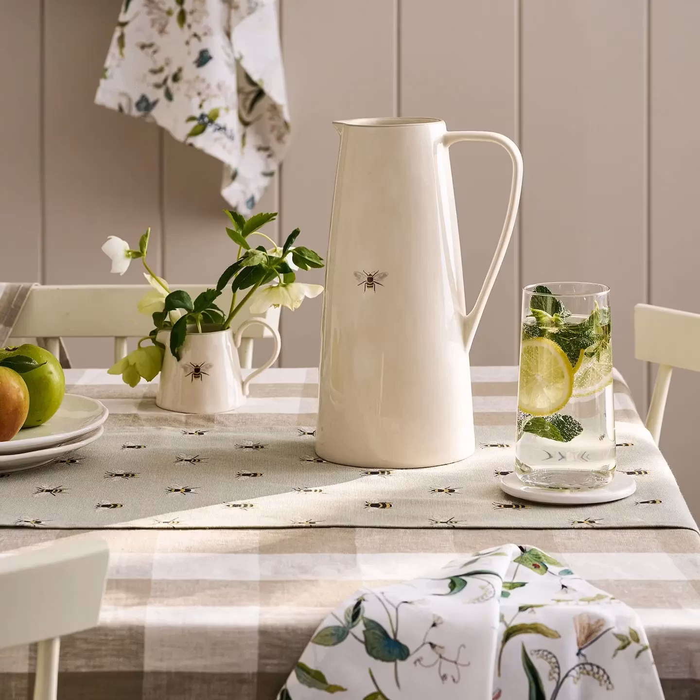 Duka och servera i lantlig charm med denna vackert utformade höga stengodskanna, designad med Sophie Allport's karakteristiska handritade bidesign. Perfekt för att servera drycker eller som en vas för blommor. Den gräddfärgade ytan och den delikata bidesignen utgör ett vackert tillskott till vilket lantkök eller matsalsmiljö som helst.