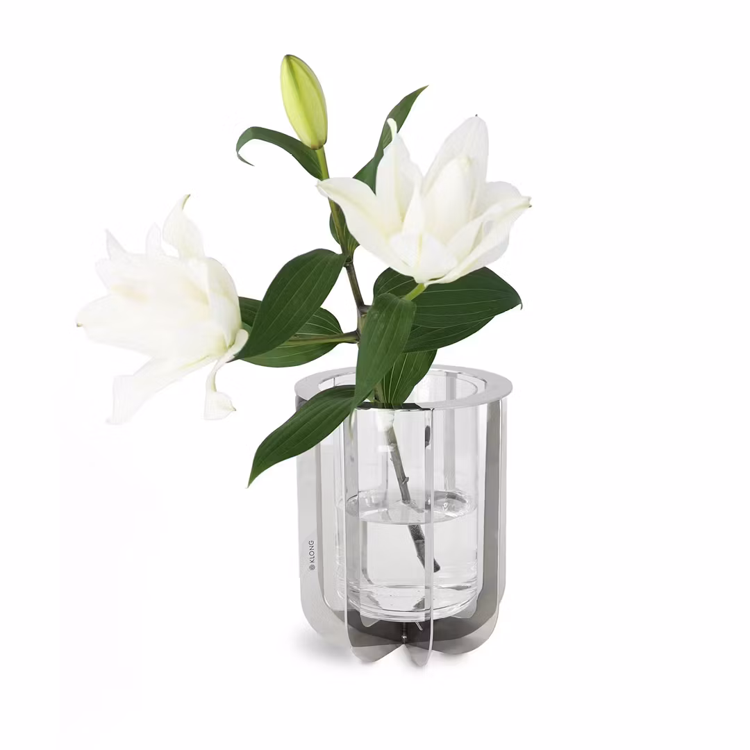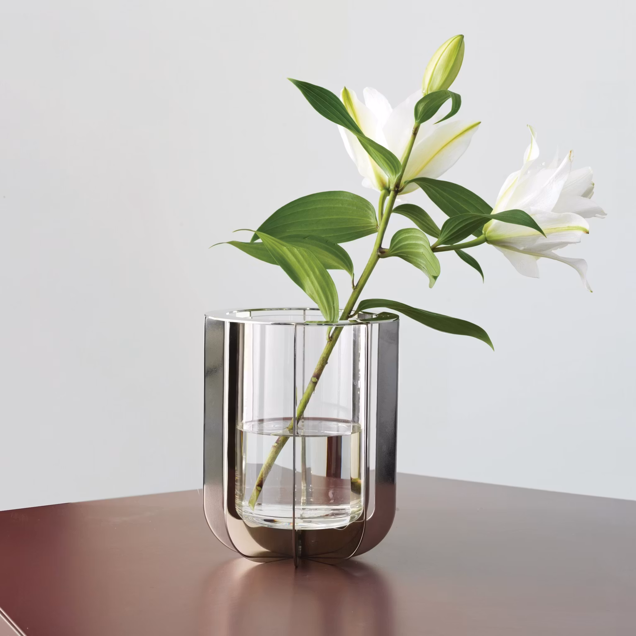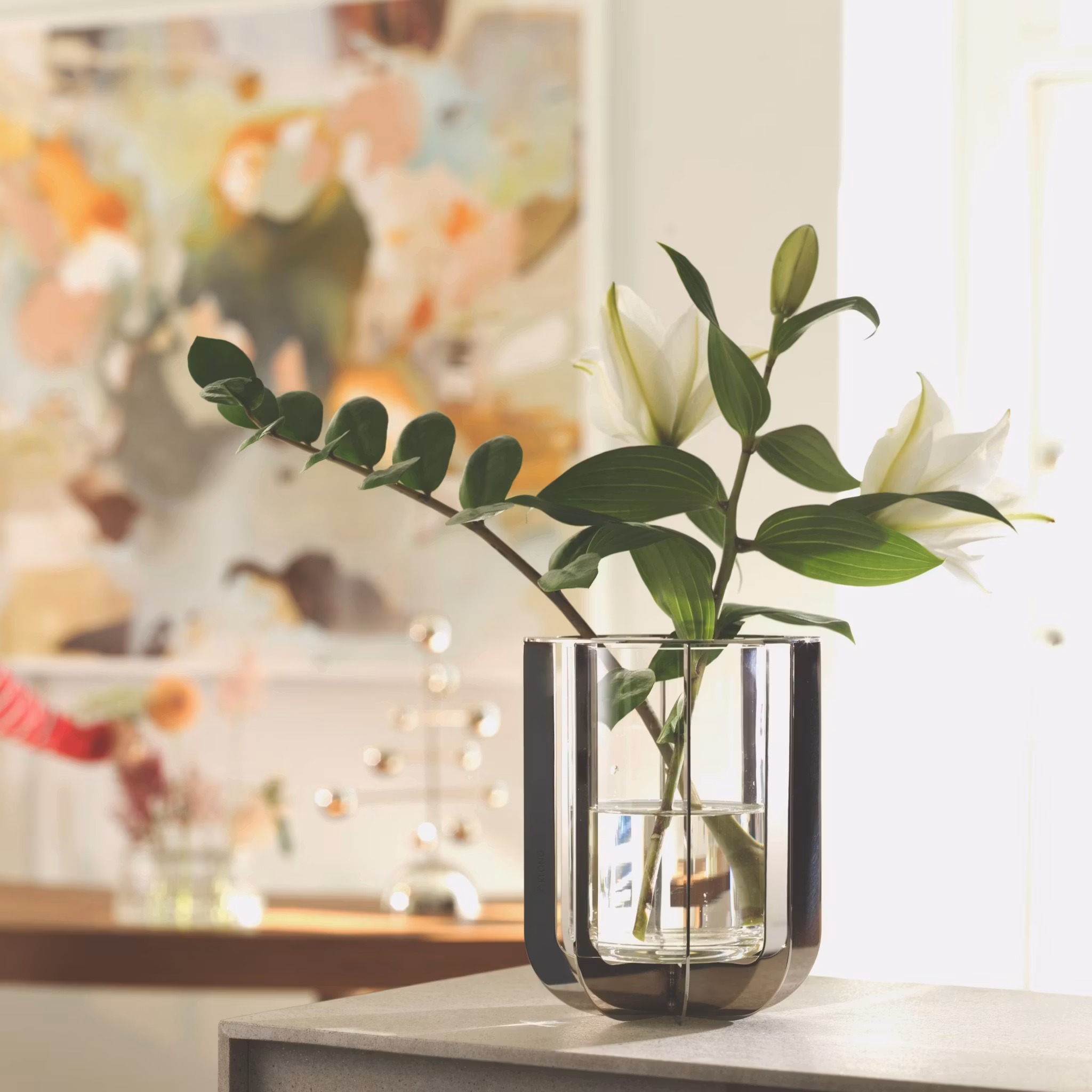 Anki Gneib har formgivit ett naturligt tillskott till Jazz-familjen som tidigare bestått av två ljuslyktor i två storlekar. Den strikta skulpturala metallstrukturen hämtar inspiration från de glada 20-talets Art Deco och jazzens storhetstid. Till vasen kommer en glascylinder som enkelt kan lyftas ur och diskas separat. Vasen är framtagen för att komplettera blommorna och inte ta över intrycket.Material: Nickelpläterat rostfritt stål