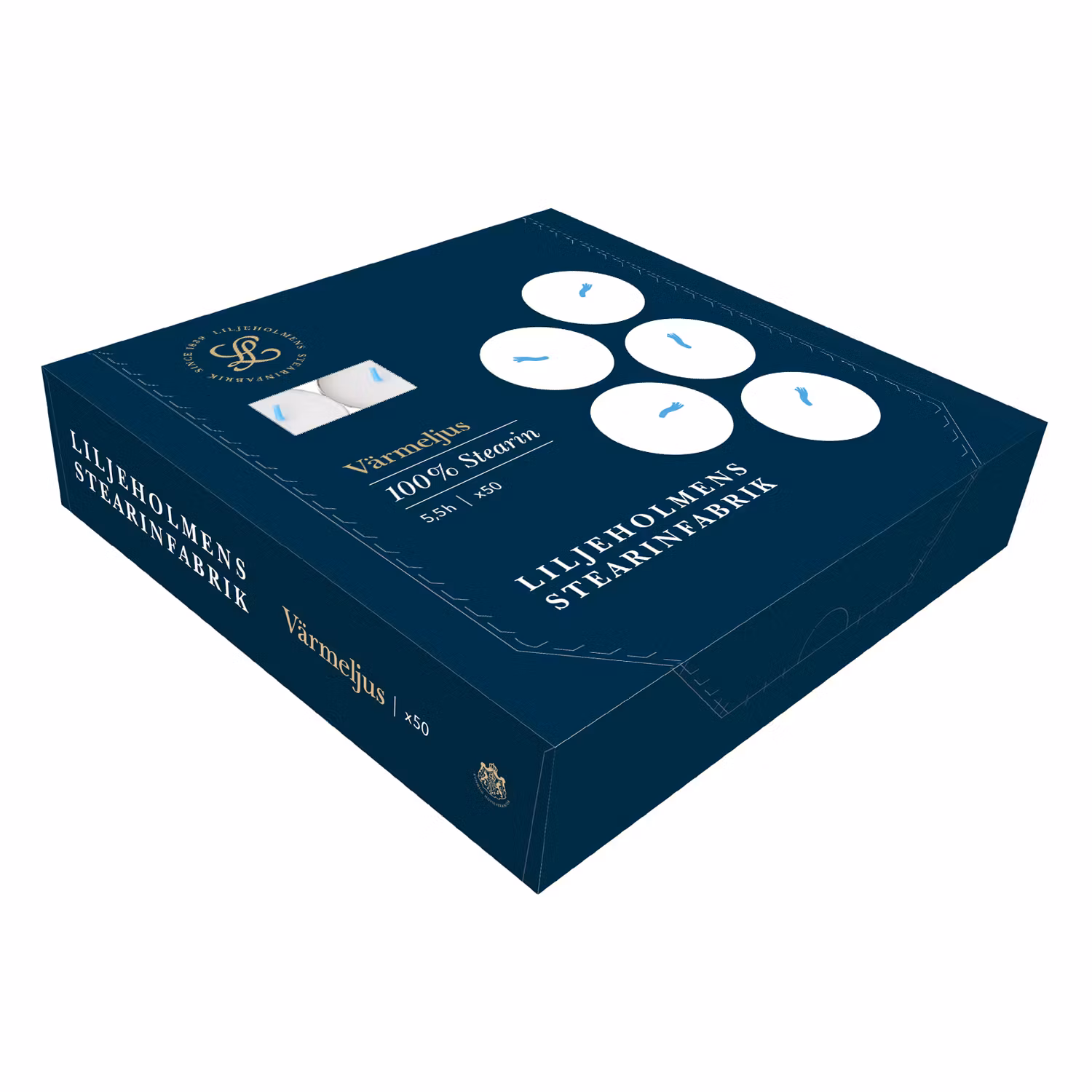 Liljeholmens värmeljus 50-pack är tillverkade i 100 % stearin, vilket ger en klar, ren låga och en behaglig ljusupplevelse. Med en standarddiameter på cirka 38 mm passar de perfekt i ljuslyktor och är ett utmärkt val för dig som vill köpa ljus i storpack.