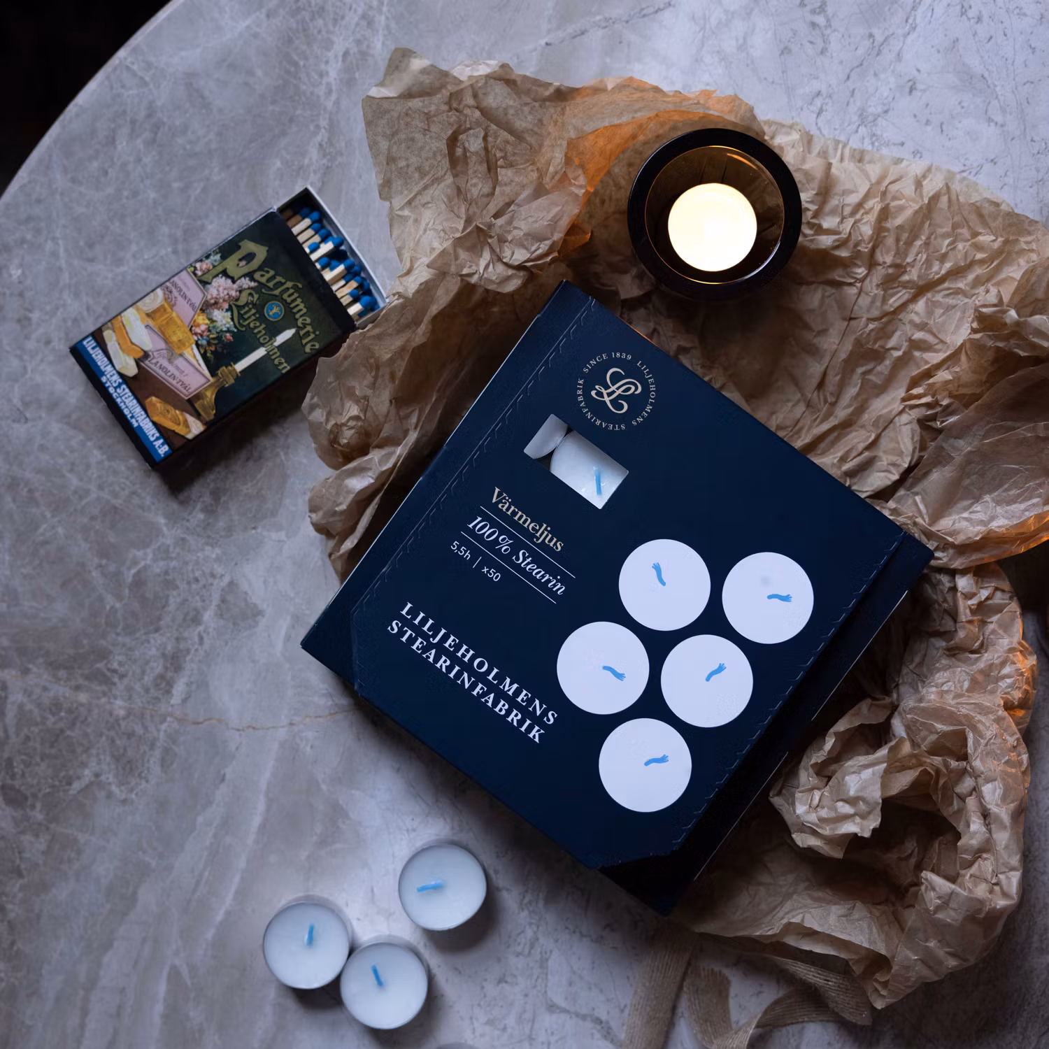 Som en del av Liljeholmens hållbarhetsarbete levereras värmeljusen nu i en plastfri pappersförpackning. Förpackningen har en praktisk återförslutningsbar flik som gör förvaringen enkel och håller ljusen skyddade tills det är dags att använda dem.