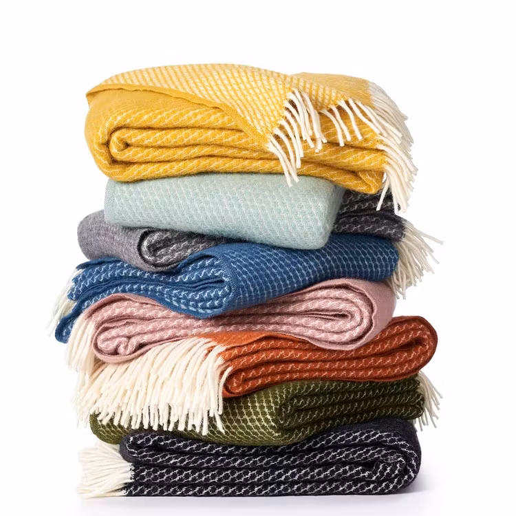 Velvet ullpläd från Klippan Yllefabrik i härligt saffransgul färg. Tillverkad i borstad lammull med vävt mönster som är ljusare på aviga sidan. Fin och användbar inredningsdetalj som är lika snygg att lägga på soffan som på sängen. Mönster och frans i offwhite.