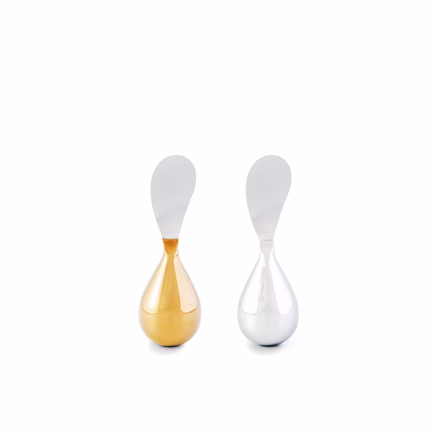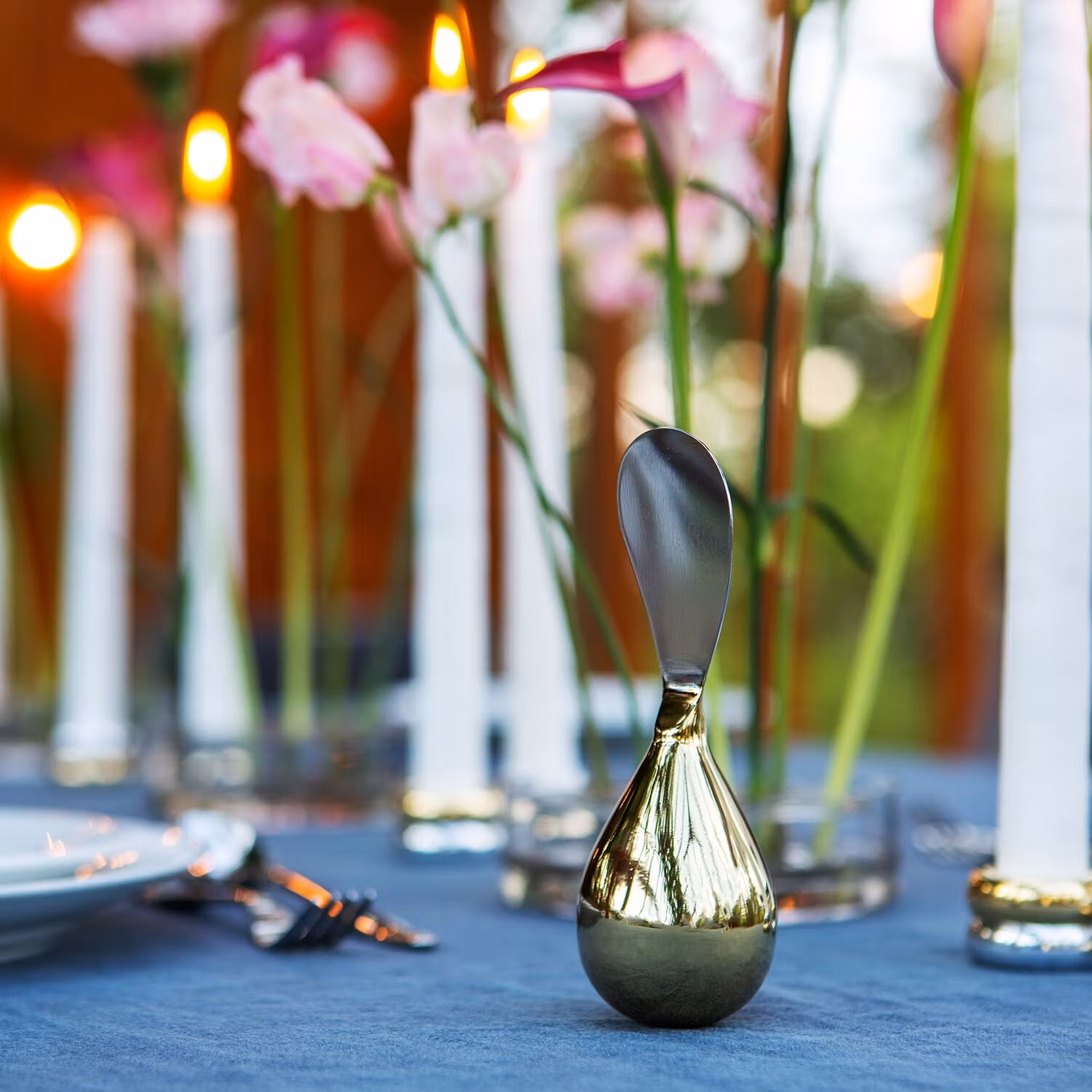 Material: Smörkniven är gjorda i rostfritt stål och den med förgyllt skaft har en PVD-beläggning i titanium.